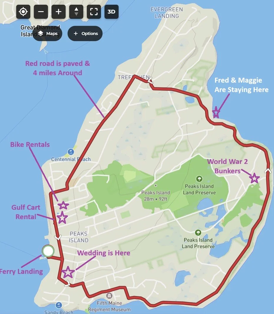 Once you get to the island you will exit the ferry and walk about 50 yards in an orderly fashion to the Peaks Island Inn which is where the wedding is located.